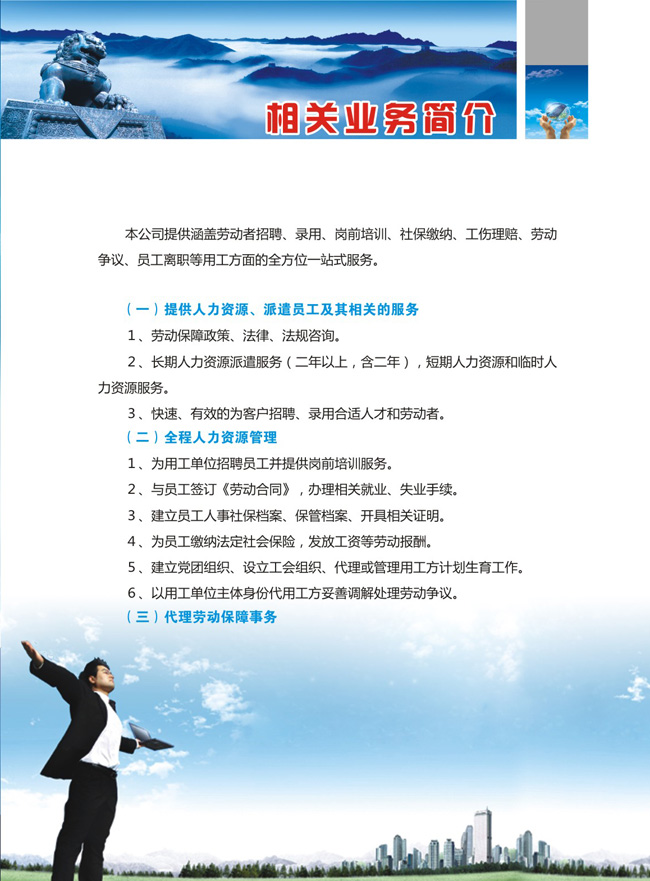 本公司提供涵蓋勞動(dòng)者招聘、錄用、崗前培訓(xùn)、社保繳納、工傷理賠、勞動(dòng)爭(zhēng)議、員工離職等用工方面的全方位一站式服務(wù)。